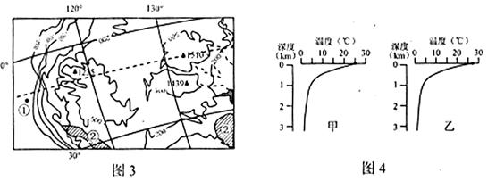 3、单选题 下图图3示意某大陆部分地区及附近地形分布图,图4中甲图示意图3中①地海水温度的垂直分布,乙图示意该大陆与①地同纬度大陆东侧海域的水温垂直分布,读图回答题.1.图3中②地区农业生产发达,其主要农业地域类型是2.有关图4海水温度变化及原因的叙述,正确的是