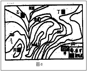 【小题3】梯田应位于坡度较缓地区,坡度大于25°的地区开辟梯田容易造成水土流失,①地等高线较密集,坡度较陡,不适宜修建梯田,故A错误;②地矿产资源丰富,但地处河流中上游,若此处发展工业易对下游水体造成污染,故B错误;丁地区有陡崖,但并无河流经过,因此没有形成瀑布,故D错误。