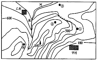(1)乙村在甲村的 方向,图中从①处能否直接看到②处? (2分)