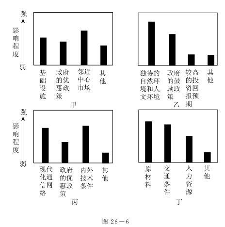 3、单选题 图26-6中甲、乙、丙、丁表示了我国四个地区的优势产业形成的要素,这四个地区的优势产业依次是