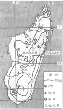 下图为某岛屿示意图,随着加拿大、澳大利亚、中国等国投资者的进入,目前该岛矿产领域正迎来由工业生产代替手工生产的快速转型期,矿业得以迅猛发展。