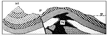本题解析:(1)图示M处中间岩层向下凹,故判断为向斜;向斜成山,主要从外力作用的角度分析。(2)图示N处岩浆侵入,故判断为冷凝作用形成的侵入岩,附近的岩石受岩浆活动时的高温高压条件,可能发生变质作用而形成变质岩。(3)图示P附近为断层,从地质灾害和岩层断裂,容易漏水分析不利于水库建设。