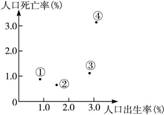 本题解析:第(1)题,人口自然增长率=出生率-死亡率。把图中四个点的人口死亡率、出生率依次读取并进行计算,可知③点人口自然增长率数值最大。第(2)题,现代型人口增长模式是低出生率、低死亡率,图中①点最符合;原始型人口增长模式的特征是高出生率、高死亡率,图中④点最符合。