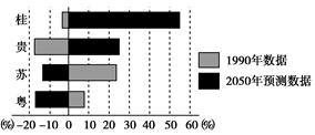 1、单选题  基于粤、苏、贵、桂四省区1990年的老年人口数量、自然增长率、省际人口迁移、经济发展水平,专家预测了2050年这四个省区的老年人口比重变化。读图完成小题。