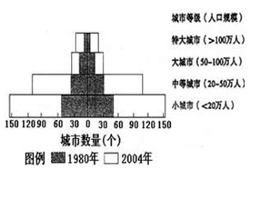 2、单选题 读“我国1980年和2004年城市等级规模金字塔示意图”。下列叙述不正确的是
