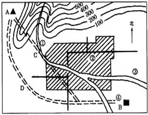 (2)自来水厂应布局于合理上游,水质好;化工厂生产有水污染,应布局于河流下游,减少对市区的水污染。故①处不合理。商场应布局于市中心,人流量大,接近最大的消费市场;故布局合理。钢铁厂生产有大气污染,故应布局于盛行风向的下风向,且靠近能源地,接近铁路,交通便利。故布局合理。