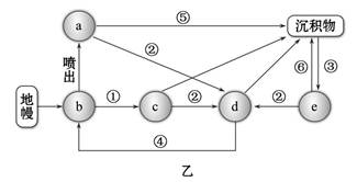 小题1:有甲图可知:甲图中的岩石形态具有层理结构,因此岩石类型为沉积岩,其形成作用力为外力作用。由乙图可知,图中沉积物通过③作用指向e,则可判断e为沉积岩,③代表外力作用(固结成岩作用),故本小题选C。又由图可知,A喷出形成E,则可判断A为岩浆,E为喷出型岩浆岩,B没有喷出地表,来源于岩浆,则B为侵入型岩浆岩。