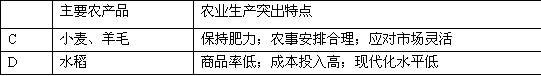 (2)C、D两区域自然环境及社会经济条件的差异,形成不同的农业生产特点,完成下列对比表格。(8分)