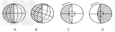 4、单选题 太阳直射点在地球上的南北移动造成了各地昼夜长短的变化。图中的斜线部分表示黑夜,其中能反映济南白天最短的是: