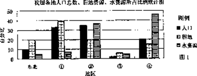 4、单选题 下图为2009年我国各地区水资源、人口总数、耕地资源统计图(图中数据单位:%)。回答1~2题。