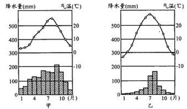 材料二 某地(甲图)和我国石家庄(乙图)气候资料。