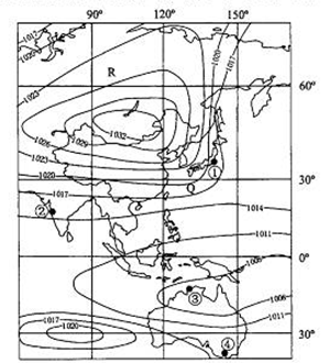 (2)R (2分)? R地等压线更稀疏,水平气压梯度力更小;R地位于陆地摩擦力更大(4分)
