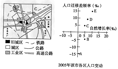 5、综合题 以下是某城市略图(该城市有四个工业区,分别是钢铁、机械、轻纺和高新技术产业开发区)及该市2005年各地区人口变动(人口迁移差额率指人口迁入率与人口迁出率之差),1995-2005年三大产业比重变化示意图。读图,完成下列问题。