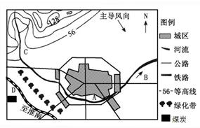 2、综合题 下图是我国某城市布局规划图,要在A、B、C、D四个地区建火力发电厂、自来水厂、印染厂、服装厂,并在城郊建立副食品基地及进行绿化建设。试从经济效益、环境因素考虑,回答下列问题。(12分)