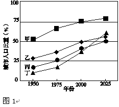 1、单选题 图1中四条折线示意中国、全世界、发展中国家和发达国家的城市化水平及其变化趋势。读图完成(1)~(2)题。