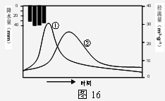 材料二:图16为不同时期该地区城市河流在等量降水过程后形成的洪水过程线示意图。