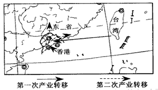2、单选题 20世纪70~80年代和90年代珠江三角洲地区经历了两次大规模的产业转移,读图(图中阴影部分表示珠江三角洲),完成1—2题。