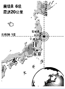 材料一:北京时间2011年3月11日13:46,日本宫城县附近海域(143.2° E,38.1 °N)发生里氏9.0级强烈地地震,并引发巨大海啸和核泄漏危机。中国国内更是上演了一次抢盐风波。
