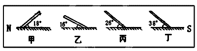 影响太阳能的因素主要是大气厚度和干洁程度,而影响大气厚度的因素首先是纬度,纬度越低太阳高度越大,根据题目中四座太阳能电站春分日正午电池板倾角,以及图中阳光的来向,可知:甲地正午太阳高度为72°,由正午太阳高度的计算公式可知,当地纬度为18°S;乙地正午太阳高度为74°,由正午太阳高度的计算公式可知,当地纬度为16°N;丙地正午太阳高度为64°,由正午太阳高度的计算公式可知,当地纬度为26°N;丁地正午太阳高度为62°,由正午太阳高度的计算公式可知,当地纬度为38°N,所以四地中由南向北的是甲乙丙丁,本题选D。