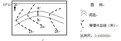 小题2:当潜水位高于河水水位时,潜水补给河水,为河流枯水期;当潜水位低于河水水位时,河水补给潜水,为河流丰水期。结合图示纬度、大陆西岸可知该地为地中海气候;根据河流、等潜水位线可知河流水补给潜水,为南半球冬季,C选项正确。
