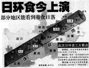 2、综合题 2010年1月15日,天空上演精彩的天文盛宴──日环食,读下图回答: