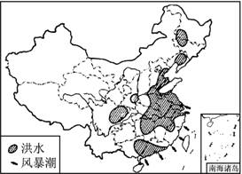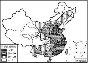 本题解析:由图可以看出,我国洪涝灾害和干旱灾害严重的地区都主要分布在东部季风气候区,其原因是夏季风的强弱和进退迟早的年际变化。在夏季风较弱的年份,锋面雨带向北挺进慢,北方降水就偏少,南方降水则偏多。在夏季风强的年份,锋面雨带向北挺进快,北方降水就偏多,南方降水则偏少。