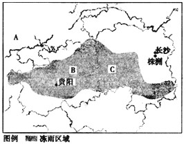3、单选题 2011年1月以来,中周南方连遭低温、雨雪、冰冻天气侵袭,中国南方八省区1791万人受灾,也给春运造成严重困难。读中央气象台2011年1月2日发布的冻雨区域预报图,回答1~2题。