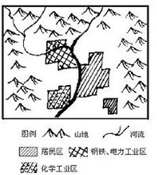 本题解析:本区城市主要沿河流分布,其形成和发展受河流和地形影响大;该城市夏季盛行东南风,冬季盛行西北风,化学工业区分布上位于河流下游地区,不会污染城市,布局合理;钢铁和电力工业区分布不合理,冬季会造成居民区上空的大气污染;本区发展钢铁工业说明煤炭资源丰富,位于我国华北地区,水资源不足。