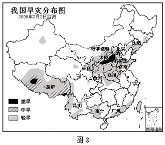 2、单选题 2008年11月至2009年2月,我国各地连发的高级别旱灾,全国近43%的小麦产区(主要为冬小麦区)受旱,370万人、185万头大牲畜发生饮水困难。读图8回答问题。