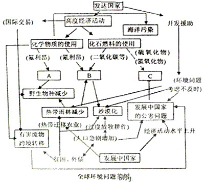 全球环境问题相互联系和相互制约,使人类面临的各种环境问题构成了一个复杂的环境问题群,上图中A、B、C代表的环境问题在整个环境问题群中占有极其重要的位置,因而被认为是三大全球性环境问题。读图回答下列问题。