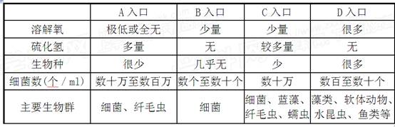 4、综合题 某中学的课外活动小组学生为了调查该地某湖泊的水质污染原因,在注入湖泊的4个主要水源入口处采集水样,检测结果如下表:(注:硫化氢是蛋白质等有机物分解的产物。纤毛虫主要以有机颗粒为食,软体动物等其它动物以细菌及浮游生物等为食)。(9分)