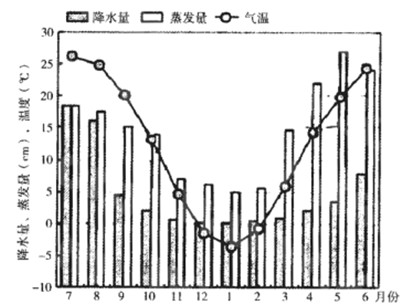 3、单选题 下图是我国某地区气温、降水量和蒸发量年内分布示意图,完成1—2题。