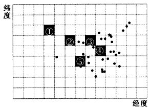 5、单选题 下图是经纬网图层和中国省级行政中心图层的叠加图,图中经纬线间隔度数相等。读图,回答1—3题。