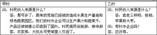 本题解析:(1)由大炕头、老三样(核桃、苹果和大枣)推断该区域可能位于我国的华北地区。(2)从两村的情况来看,都是是农业为基础,甲在农业的基础上发展绿色蔬菜园区、村办企业和民俗旅游,甲运用了现代化农业技术,生产多样化,收入高。错误的是D。