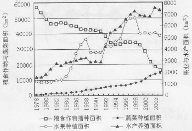 3、单选题 读我国东南某市辖区1978—2002年农业内部各业用地数量变化图,回答下列问题。