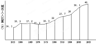 (1)图示反映从1964—1974年之间,我国的城市化水平有所下降,故选B项。