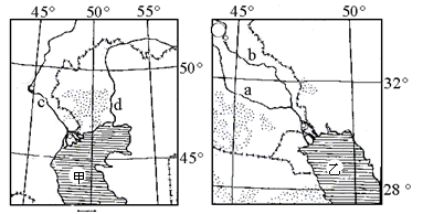 1.根据图示的经纬度位置和海陆轮廓判断,甲为里海,c表示伏尔加河,d表示乌拉尔河,乙表示波斯湾,a表示幼发拉底河,b表示底格里斯河。