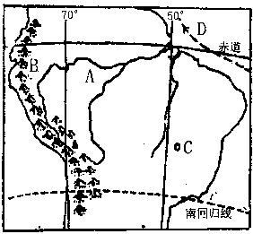 (1)图中A处有世界面积最大的?,这种资源的破坏对世界气候和生态会产生很大影响。洋流D对沿岸地区的气候具有?作用。图中B山脉西侧自然带的分布有?的特点,这符合自然带分异规律中的?。(4分)