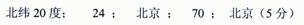 小题3:图示这一天,根据太阳直射北半球,赤道处正午太阳高度为70°,可以判断太阳直射20°N。B点正午太阳高度为20°,可以推出B点为北极点,昼长为24小时;北京(约116°E,40°N)与上海(约121°E,31°N)两地中,根据正午太阳高度的计算公式,北京的正午太阳高度为70°,上海的正午太阳高度为79°,相对较小的是北京;根据昼长的纬度分布规律,北京纬度高于上海,昼长上海小于北京。