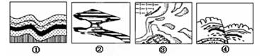 本题解析:本题考查地质作用。图示①表示褶皱、④表示断层,为内力作用的结果;②表示风蚀蘑菇,为干旱地区(西北地区)常见的地貌景观;③表示河口三角洲,为流水沉积地貌。