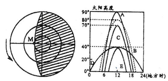 5、综合题 (11分)图为世界时(零时区)某日1时40分的光照图(阴影部分为黑夜),图中的A--E是这一天全球5个地点的太阳高度日变化曲线。读图完成下列问题。