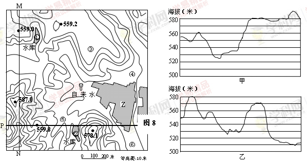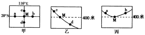 2、单选题 下面三幅图中,甲图为M地附近地区的平面图,乙图和丙图分别为过甲图相应的点所作的地形剖面图。读图回答1—2题。