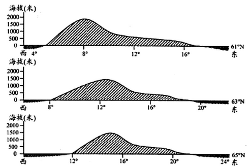 2、单选题 下图为某半岛沿不同纬线的地形剖面图,读图回答下列问题。