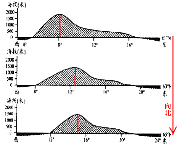 【小题1】由三幅剖面图可以看出自上而下,纬度越来越高,即所做剖面图的位置越来越偏北;图中剖面图的最高点由8°E到13°E、15°E左右,即越来越偏东,如下图,所以山地的走向是东北——西南走向,故选项A正确。