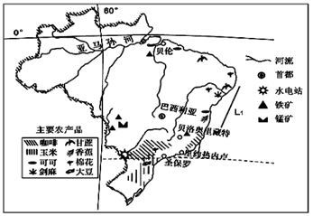 (3)巴西东南部地处沿海平原、地势低平;受热带草原气候和热带雨林气候影响气候适宜;河流较多水源充足;距海较近海陆运输方便;工农业发达,城市众多。(任答3点给3分)
