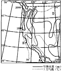 (1)据图(北美洲)可知,A、B、C三地降水量差异较大,试从大气环流的角度分析其形成原因。