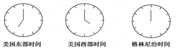 小题3:到达美国后,酒店大堂悬挂着三个大钟(如下图所示),这时北京时间可能为( )