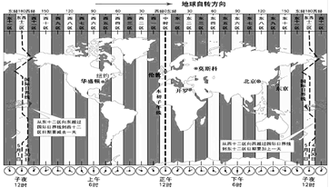 4、综合题 读“时区和国际日界线”图,回答下列问题: (9分)