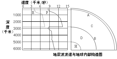 2、综合题 读“地震波波速与地球内部构造”图,完成问题:(10分)