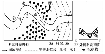 本题解析:结合图乙中E岸堆积(即左岸),F岸侵蚀(即右岸)判断,此图位于北半球;根据图中河流流向和指向标可知该地地势南高北低;该河流流经温带地区,且由较低纬流向较高纬度,故可能会发生凌汛;地下水由高潜水位流向低潜水位,且垂直于等潜水位线,故图中地下水的流向背离河流,河水补给地下水。